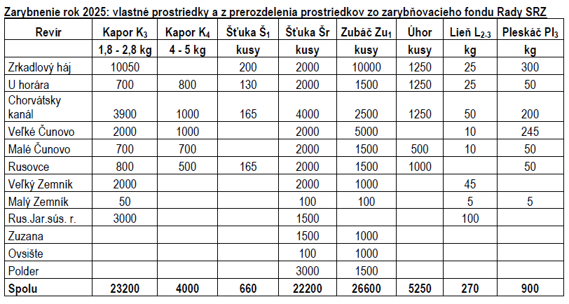 V roku 2025 zabezpečila MsO SRZ Bratislava V bohaté zarybnenie svojich revírov z vlastných prostriedkov a zároveň z prerozdelenia prostriedkov zo zarybňovacieho fondu Rady SRZ. Cieľom zarybnenia je dlhodobo udržiavať kvalitu rybárskych revírov, podporiť prirodzenú rybiu obsádku a zlepšovať možnosti športového rybolovu.